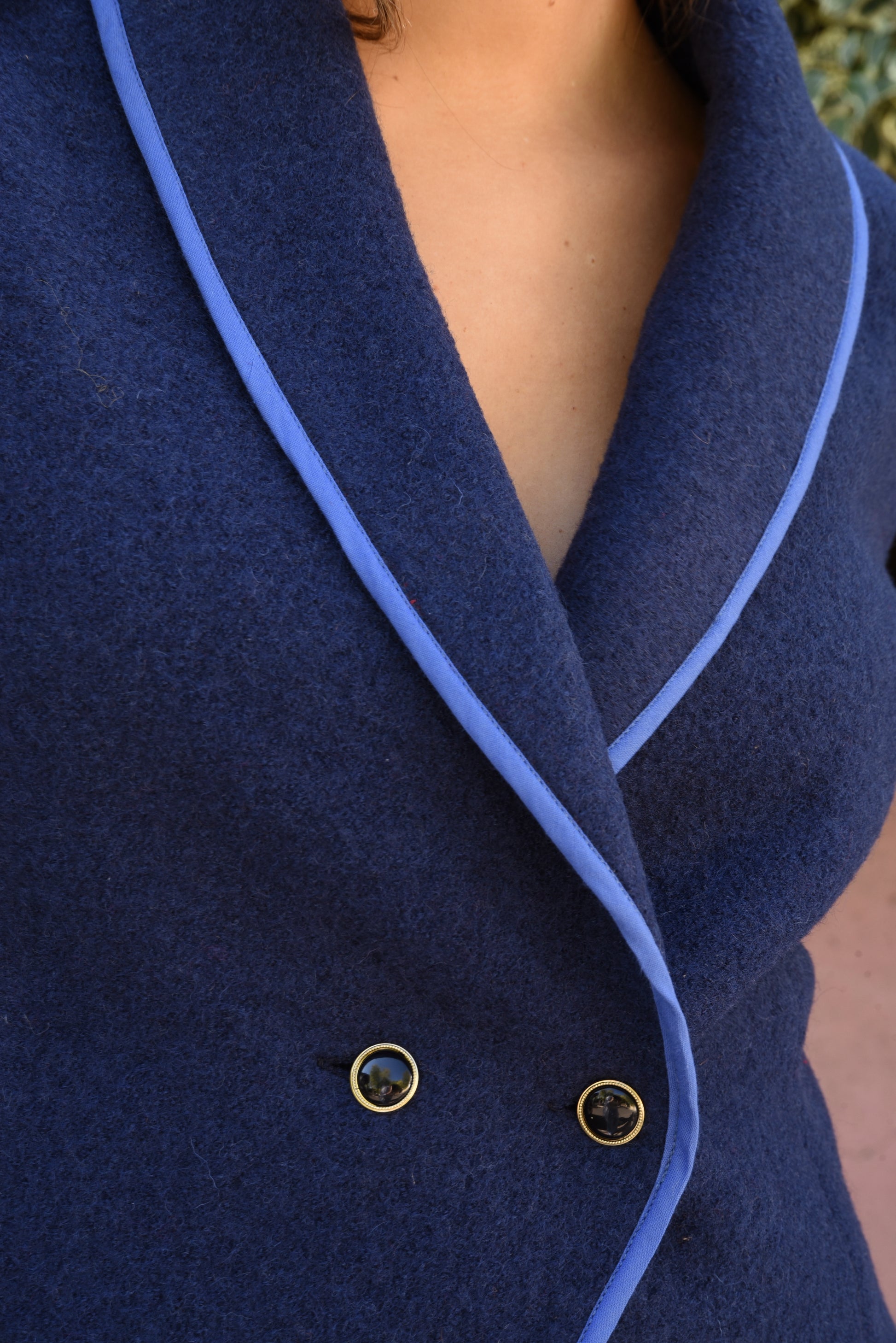 Blazer confeccionada a mano en tejido 100% lana virgen de alta calidad. Presenta un diseño cruzado con cierre de dos botones, corte entallado y acabado impecable. Todos los bordes están rematados con un vivo en tono más claro, creando un contraste sutil que resalta el color base. Una prenda única que combina artesanía y sofisticación.