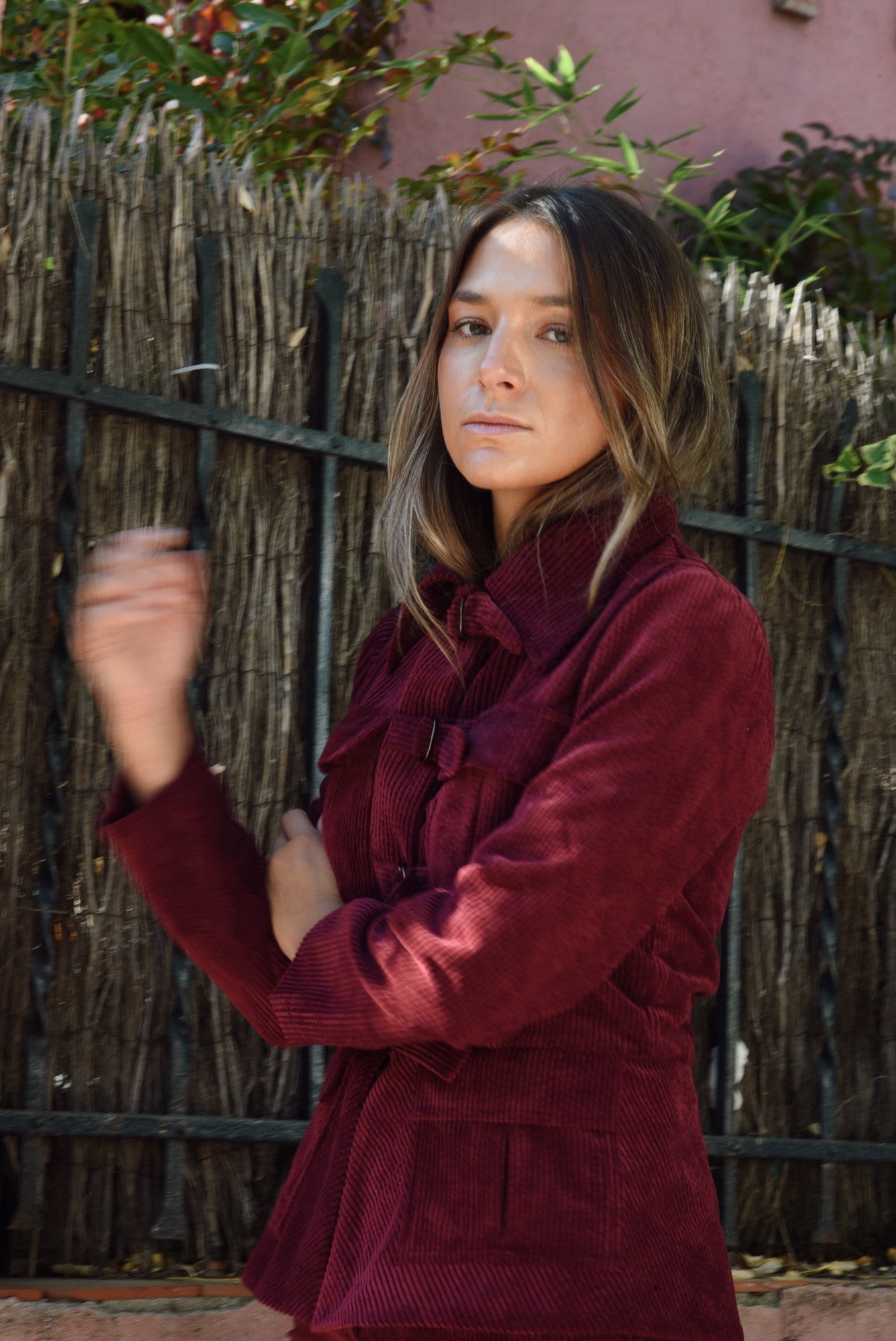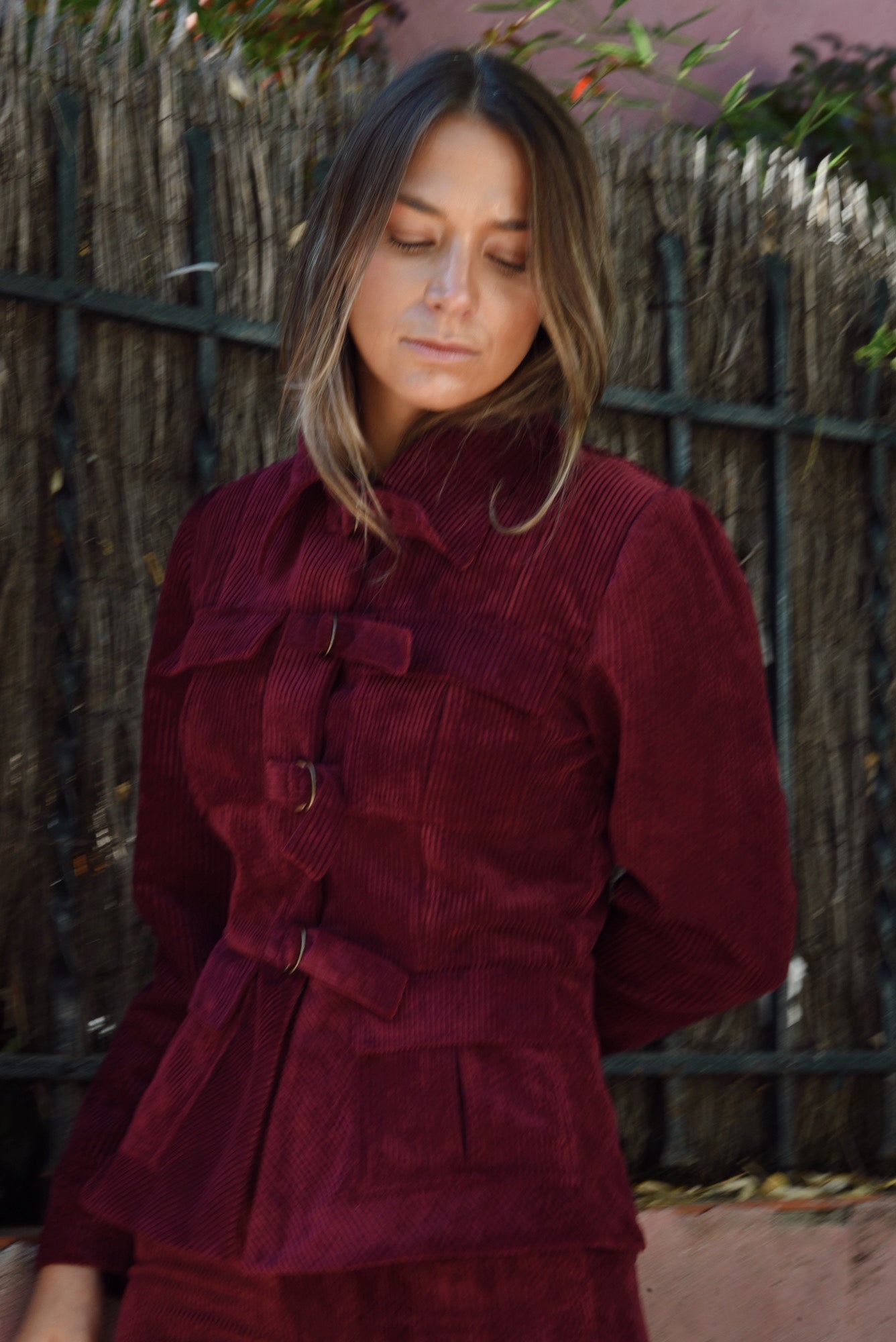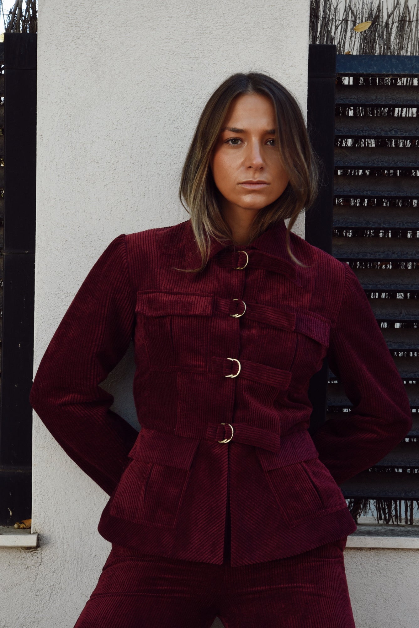 Chaqueta de pana con hebillas frontales. Chaqueta confeccionada en pana de alta calidad. Presenta cierre frontal con cuatro hebillas metálicas. Incorpora bolsillos de solapa en el pecho y la parte inferior. Su corte entallado realza la silueta.